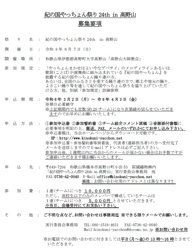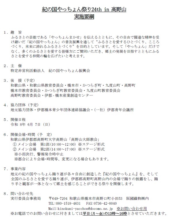 「紀の国やっちょん祭り24th in 高野山」 2026/6/7(日)開催決定!!